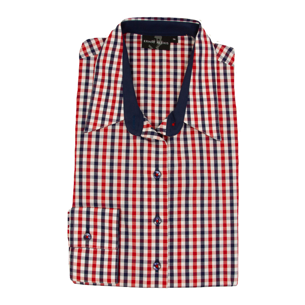 Details: Matching buttons, button thread in shirt color with contrast inside collar and cuff.