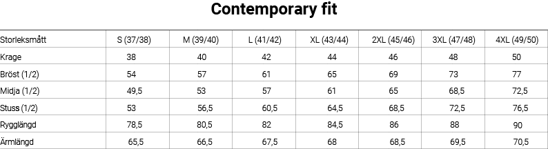 En modern passform som storleksmässigt ligger mitt emellan Classic Fit och Slim Fit. En Contemporary-skjorta passar helt enkelt bäst om man vill ha en något tightare passform som ändå inte är lika insydd i midjan som en Slim Fit.