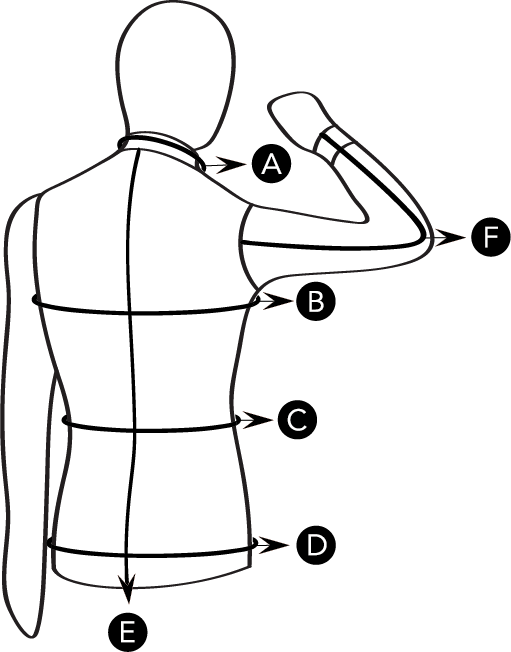 B – Bröstvidd: Mät omkretsen på det bredaste stället, nedanför armhålan.